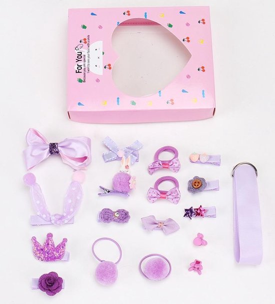 Set van 18 haarspelden en haarelastiekjes in cadeau verpakking – Geschenkset haaraccessoires voor meisjes – Paars