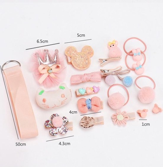 Deze set van maar liefst 18 verschillende haaraccessoires bestaat uit een mix van haarspelden en elastiekjes met daarop bloemen, strikjes, dieren, blaadjes, bolletjes en een kroon. Hiermee kunnen u en uw kind blijven variëren.