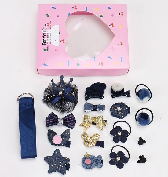 Set van 18 haarspelden en haarelastiekjes in cadeau verpakking – Geschenkset haaraccessoires voor meisjes – Donkerblauw